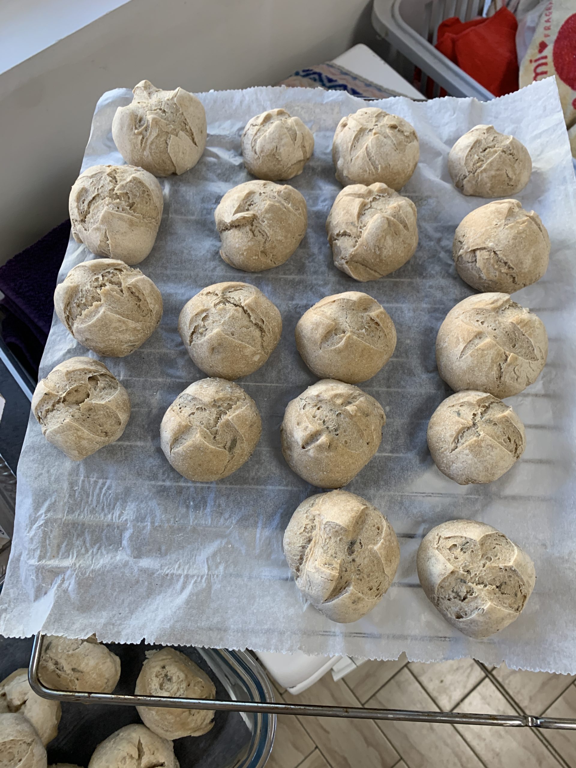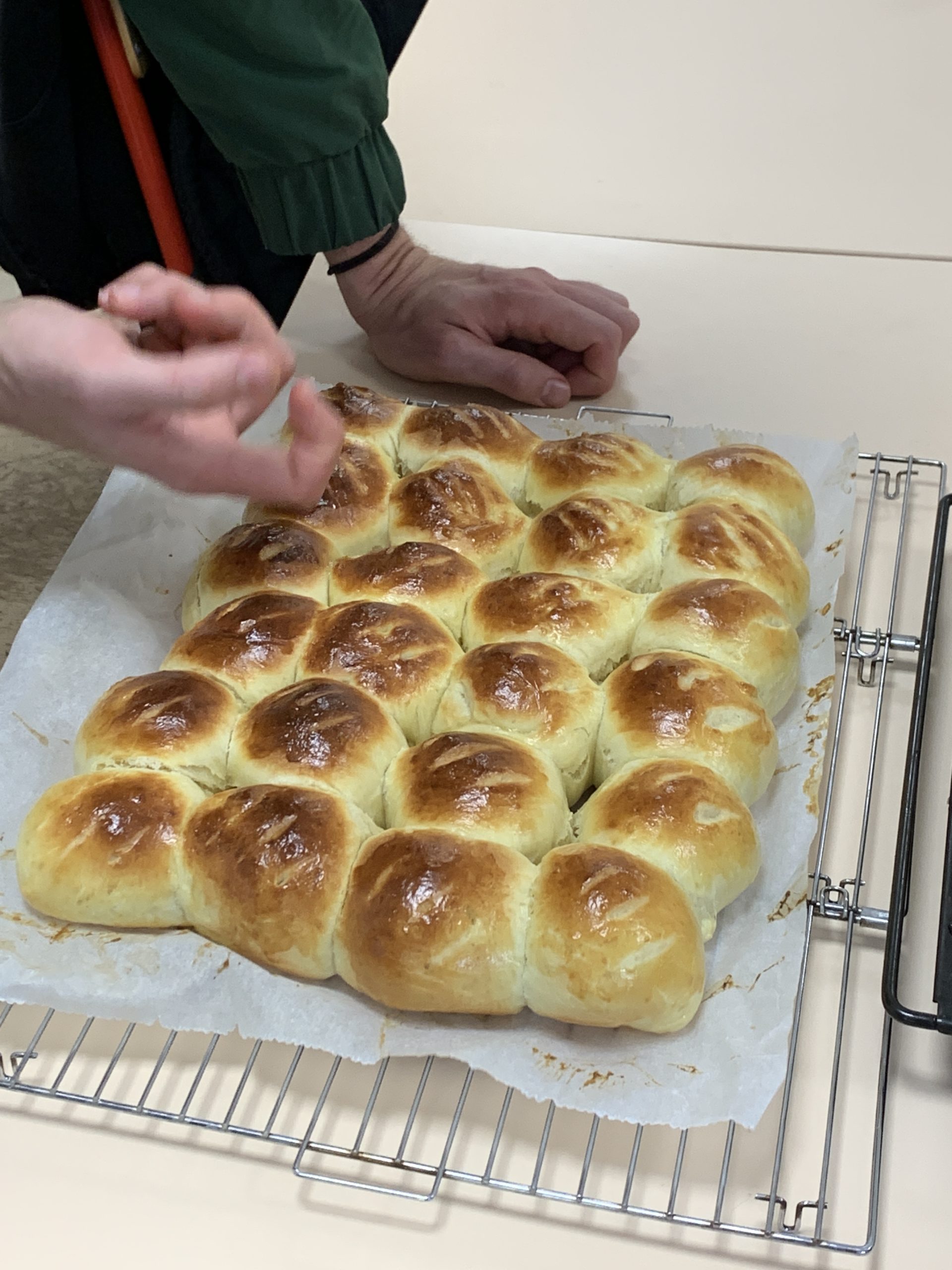 Aujourd’hui, Odile a cuisiné du pain, des petits pains au lait et de la brioche avec son maître Yohann. Je suis allée donner un coup de main le matin, et Mémie est revenue avec moi l’après-midi pour les dernières étapes.