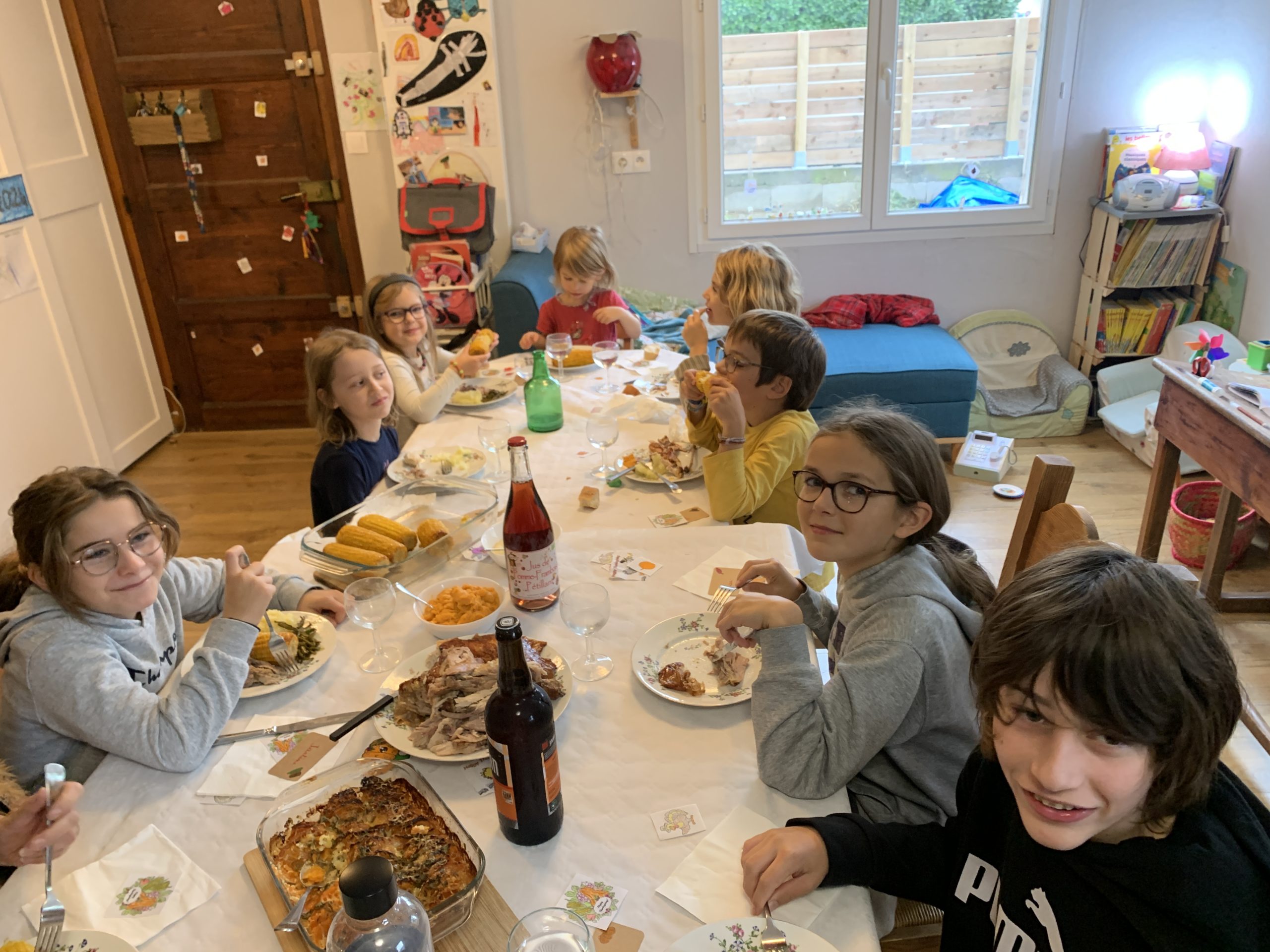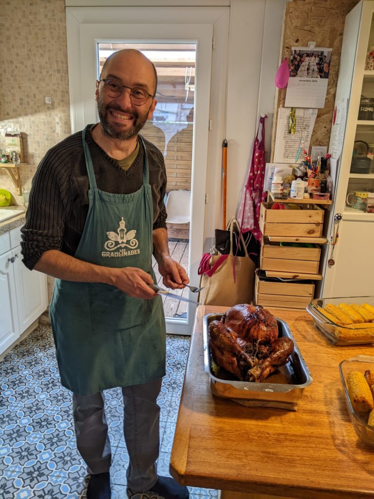 Cette année, nous avons fêté Thanksgiving chez Nathalie et Régis. Au menu : dinde, gratins et purées de carottes, panais et patate douce, sauce aux cranberries, corn on the cob. Et en dessert : gâteau aux pommes, tarte au citron et tarte à la noix de pécan.