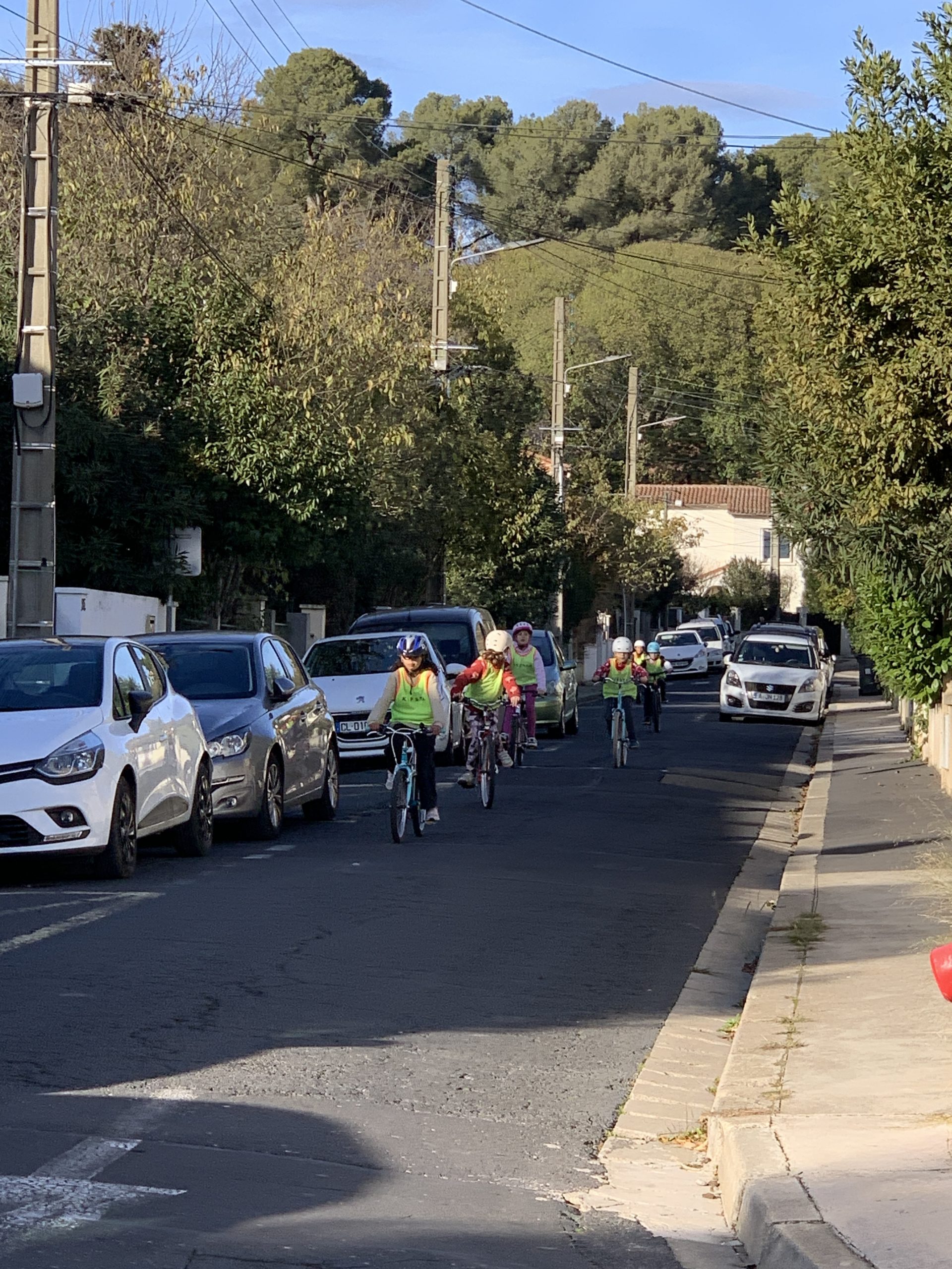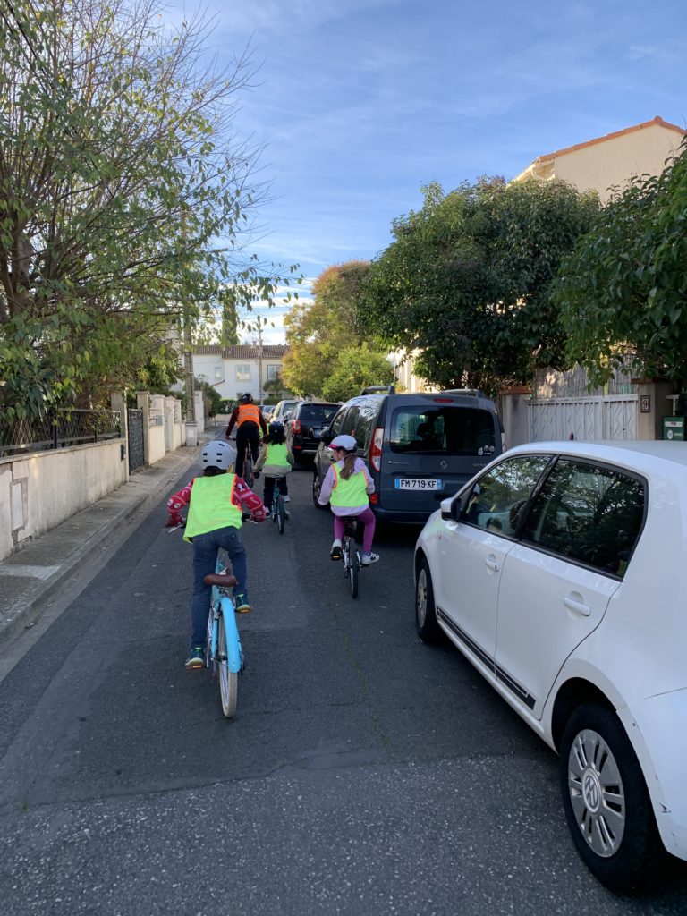 Après avoir déposée Odile à l’école, j’ai rejoint la classe d’Émile pour sa dernière journée du cycle vélo. Après des séances où ils ont appris le fonctionnement du vélo et les règles de sécurité routière, nous avons pu les emmener faire un tour en vélo, et même les laisser un peu rouler en autonomie sur un parcours précis.