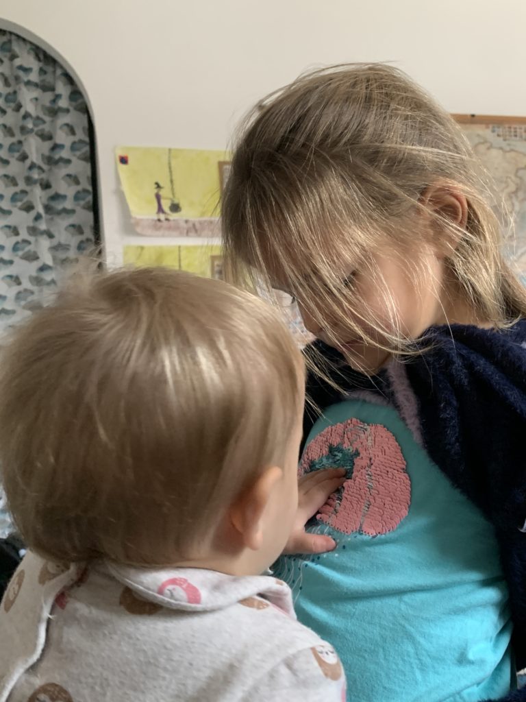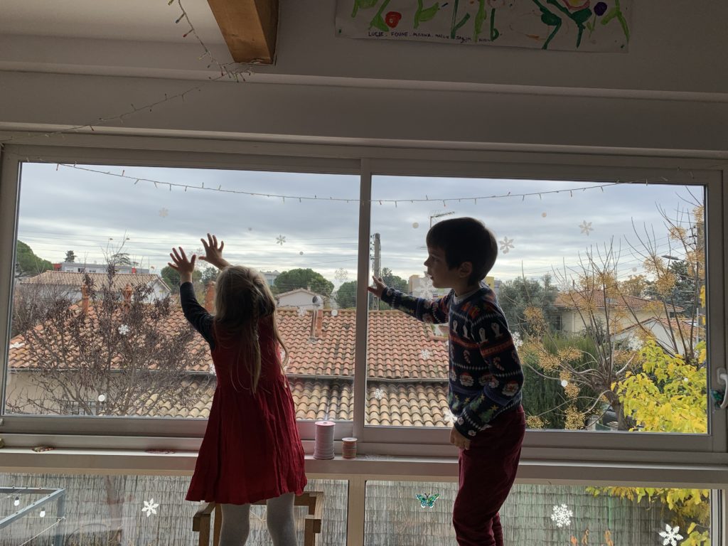 Émile et Odile ont aussi décoré la vitre de la salle de jeux ce matin.