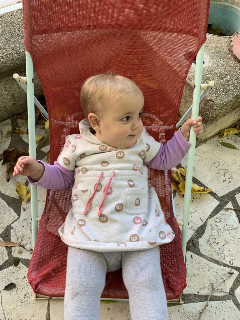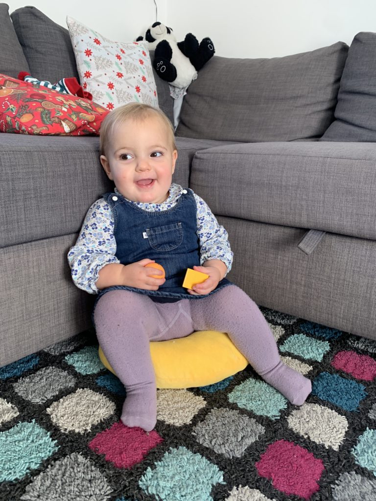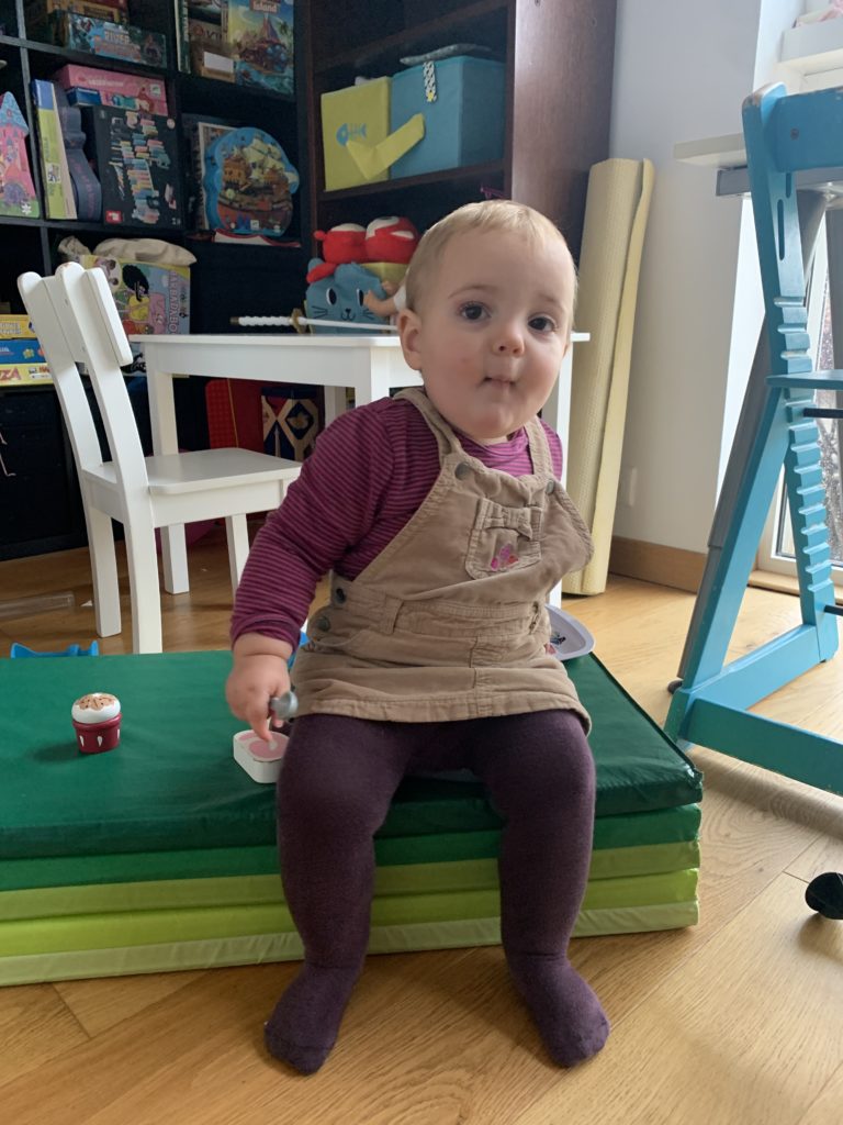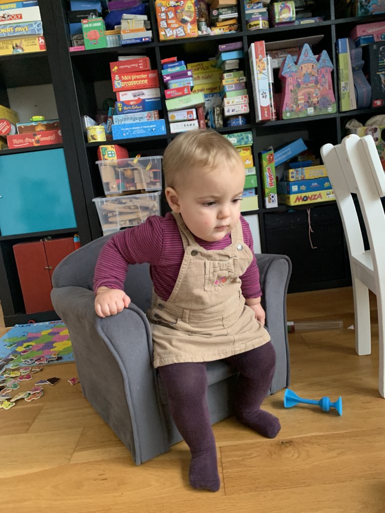 Alice adore s’asseoir sur tout ce qui fait une vingtaine de centimètres de haut. Voyez plutôt.