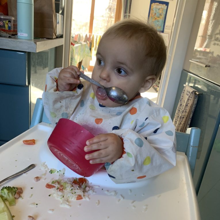 Continuer à lireAlice veut de plus en plus manger seule. Heureusement qu’elle n’est pas affamée car elle n’est pas encore très efficace.