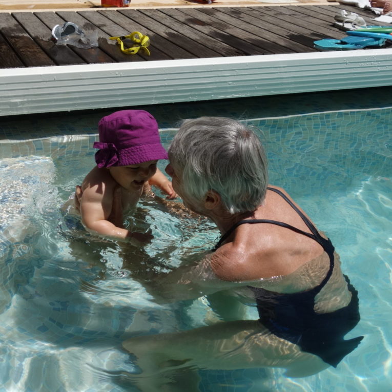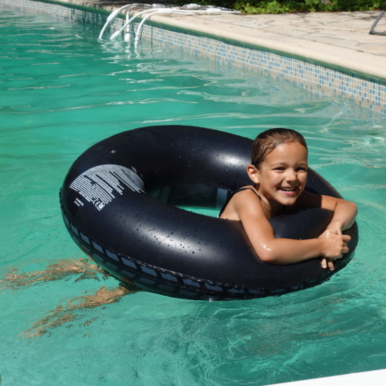 Première journée tranquille à Opio. Jeux de jardin, piscine. En fin de journée, le nouveau petit chaton d’Opio, Lili, a